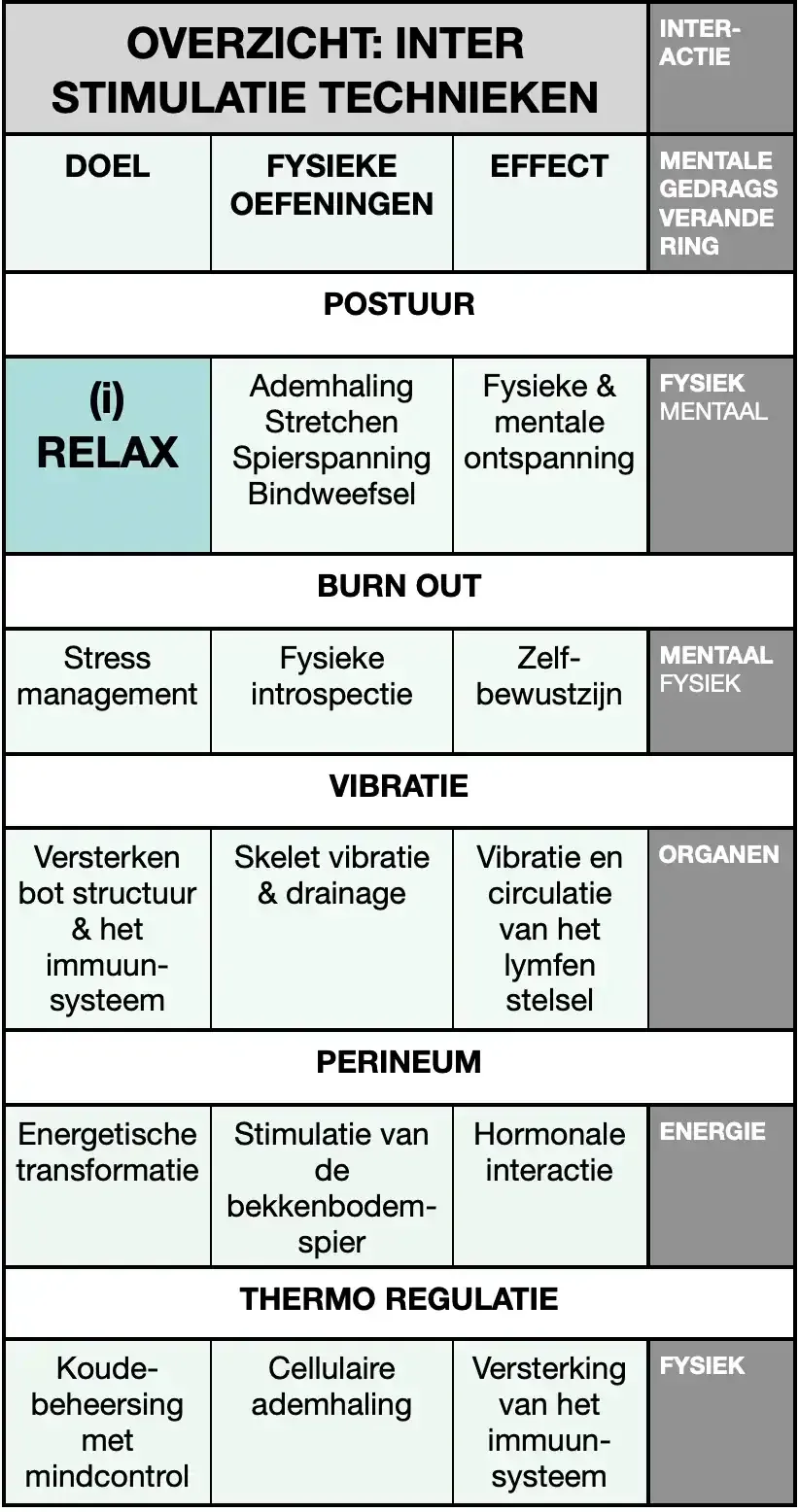 Explication du tableau « MATRICE DE PRATIQUE PHYSIQUE » : visualisation des données issues de différentes séances d’entraînement et guide pratique d’une nouvelle approche d’apprentissage. Le tableau « Techniques d’interstimulation » fournit des informations simplifiées sur le choix des objectifs, les séances d’entraînement, les différents paramètres et les interactions physiques qui ont un impact crucial sur l’amélioration du fonctionnement du corps et le maintien de l’équilibre des niveaux mental, physique et énergétique.